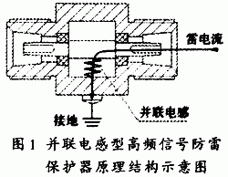 高通滤波型浪涌保护器是最早出现的天馈避雷器,由于雷电流的能量频谱分量的频率主要集中在30KHZ以下,只要防止30KHZ以下的雷电流通过,就能将雷电流的能量削减掉90%以上,所以在浪涌保护器内部腔体的芯、壳之间并联一只或数只小电感线圈,保护器外壳接地。利用并联的电感与保护器本身的腔体电容构成并联谐振回路,保护器工作带宽可以做到数百MH以上(插入耗损≤-0.2dB;驻波比≤1.2),同时使低频的雷电流通过高通滤波对地泄放,通信设备的正常信号由于并联谐振回路的作用而使信号损耗和反射为最小,使保护器起到防雷作用,产品的原理结构见下图1。