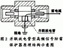 设计很简单,保护器内部做成同轴腔体外壳形式,首先考虑设备的阻抗、设备两端的相应接地方式,采用气体放电管并联于保护器内部芯线与腔体外壳之间,产品外壳接地,当同轴电缆芯皮之间受感应雷感应有过的差模电压时气体放电管动作将雷电流泄放如地,放电管动作电压的选择由保护器实际传输的功率决定。产品的原理结构见图2。