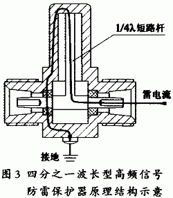 保护器内部做成同轴腔体形式,将一根相当于信号频率的1/4波长的末端短路的镀金棒并联在同轴传输线上,同轴传输线一端接芯线一端接地。